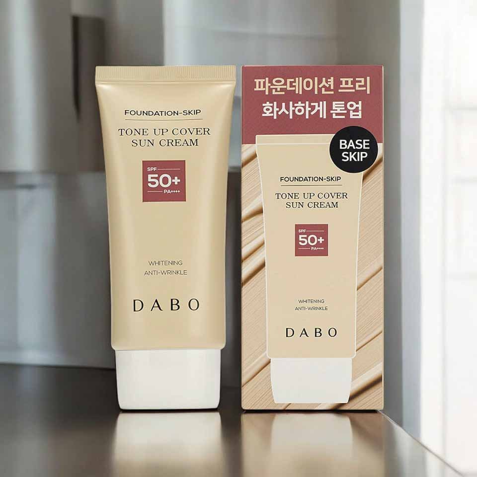 The Dabo Foundation-Skip Tone Up Cover Sun Cream SPF50+ PA+++ is a multifunctional sunscreen designed to protect the skin from harmful UV rays while providing a smooth, radiant, and even complexion. This innovative product serves as both a sunscreen and a light foundation primer, making it a must-have for those looking to simplify their skincare routine without compromising on protection or coverage.